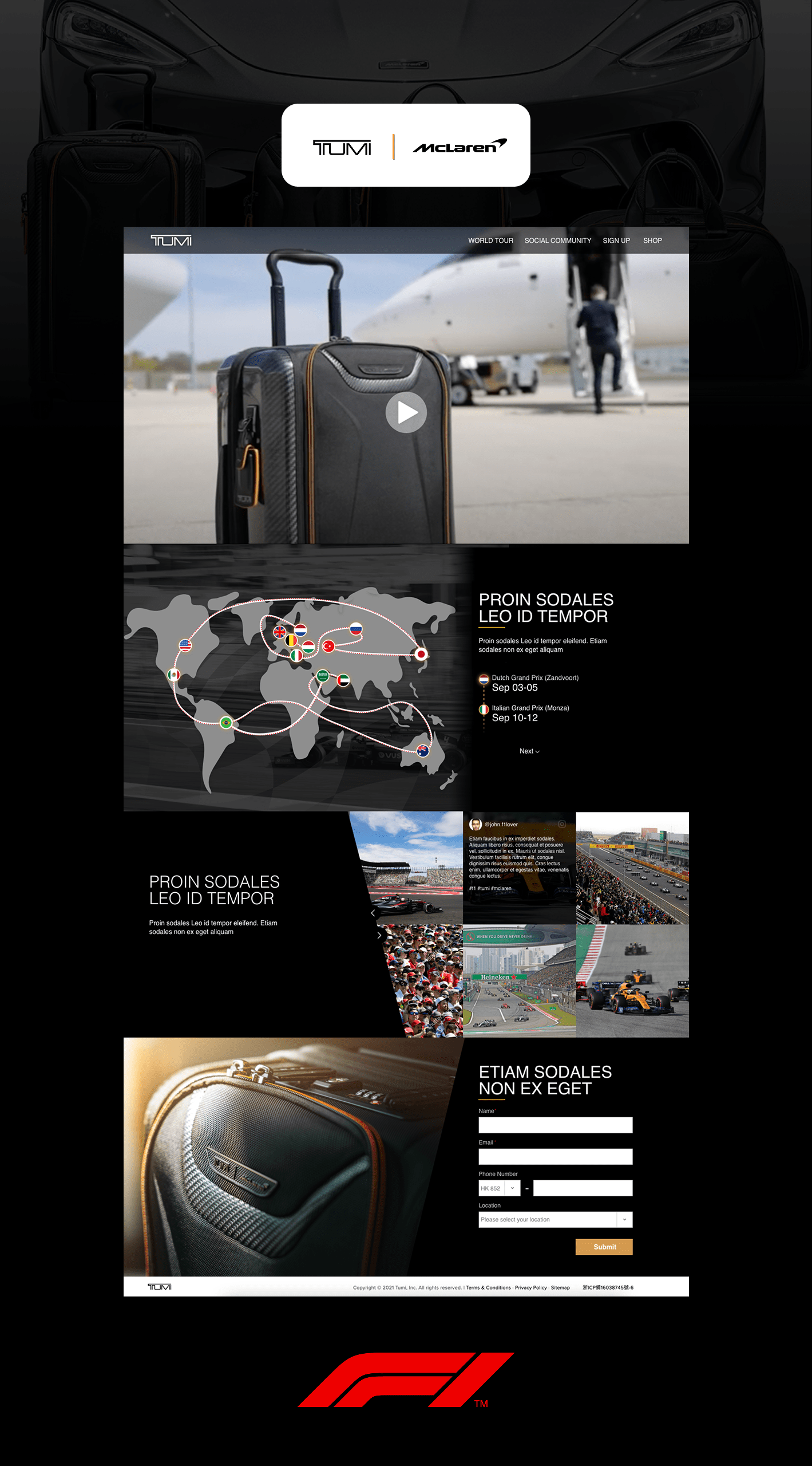 I designed a high-impact campaign landing page for the TUMI × McLaren Formula 1 2020 collaboration, aimed at showcasing the partnership’s performance-driven luggage collection. The page focused on translating the shared DNA of both brands—precision, speed, and engineering excellence—into a bold digital experience.